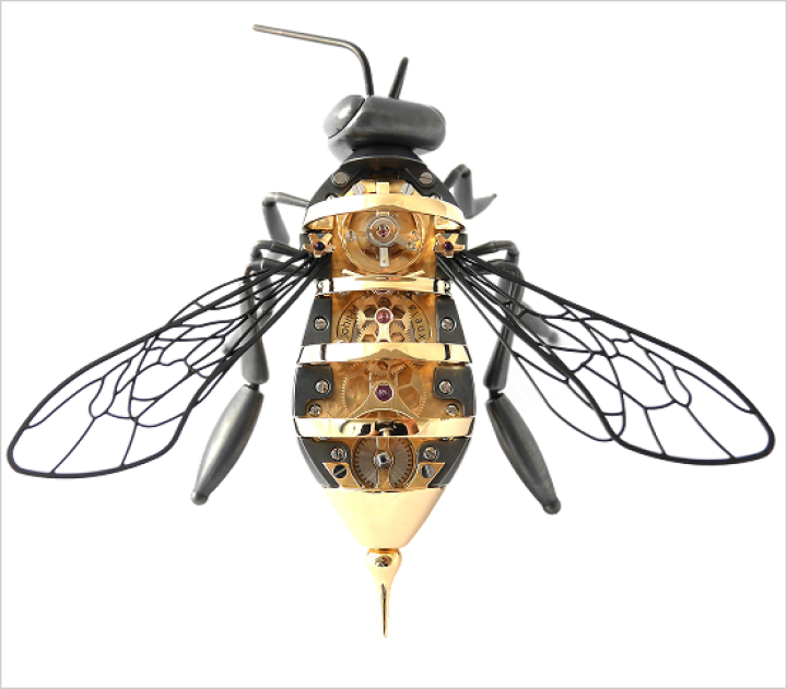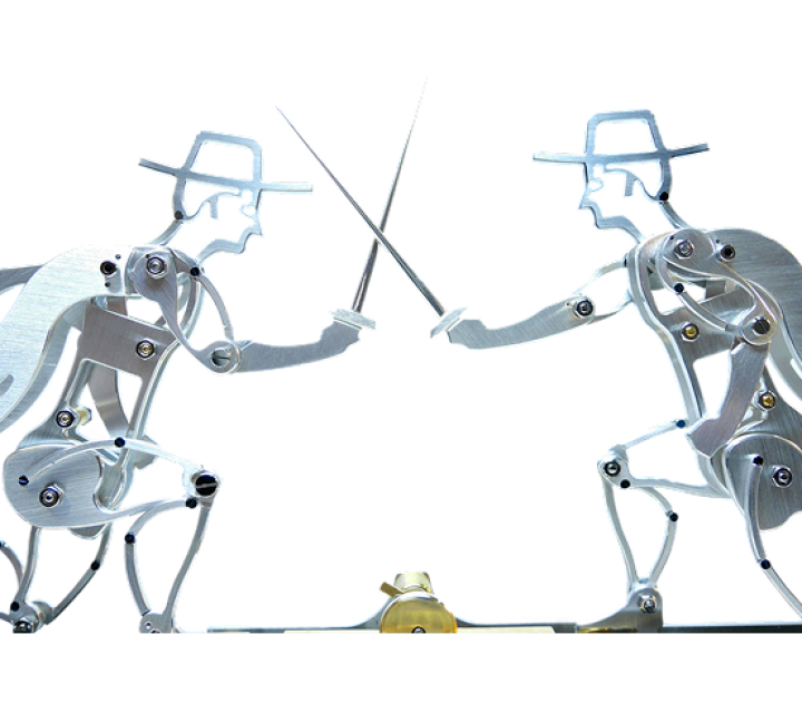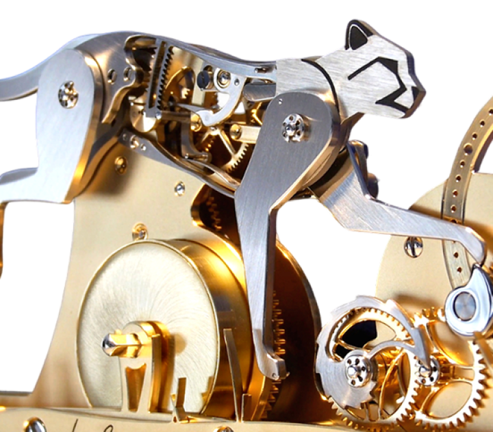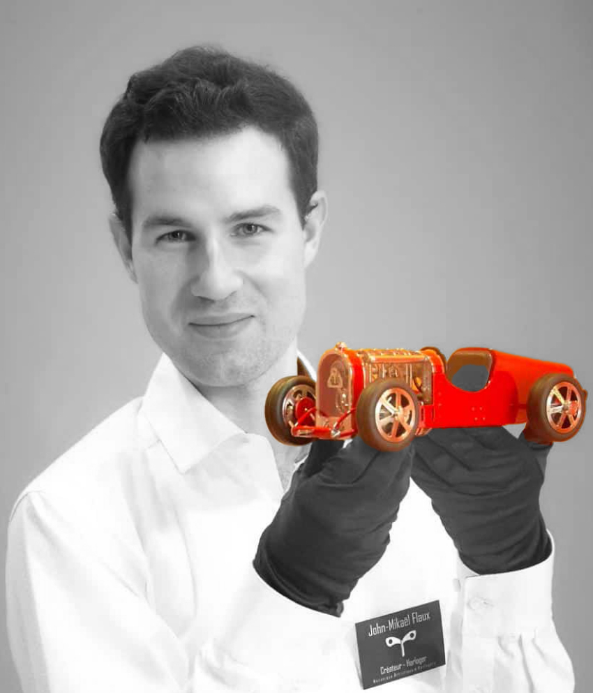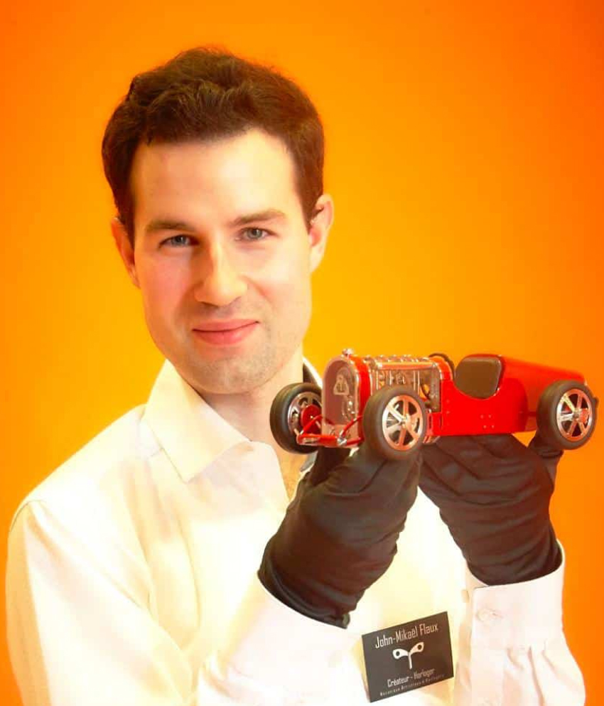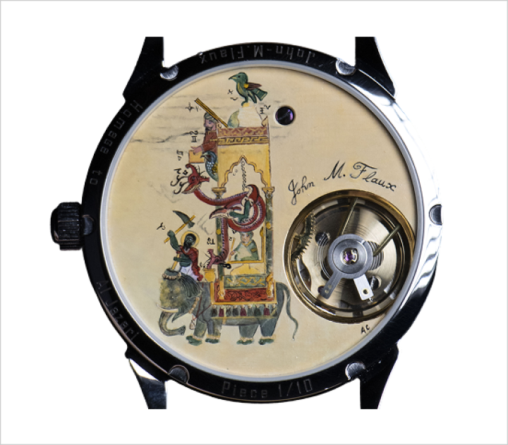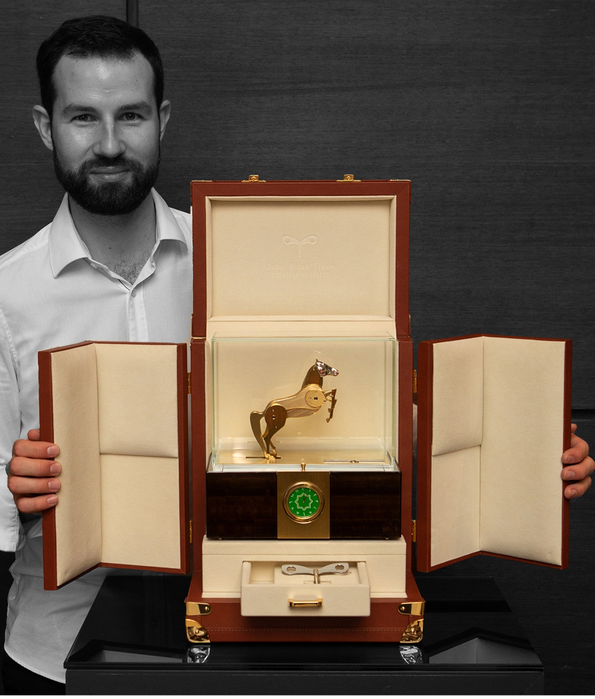 Depuis plus de dix ans, John-Mikaël Flaux conçoit et réalise à la main des automates. Diplômé en horlogerie et lauréat d’une médaille d’or au concours national « Un des Meilleurs Apprentis de France », il ouvre son propre atelier en 2008. En 2012, il est recruté par la maison suisse Ulysse Nardin en tant que designer. Devenu indépendant en 2018, il s’installe en France où il crée des automates d’exception – parmi les plus remarquables figurent le Duel, l’Horloge Automobile et le Guépard.