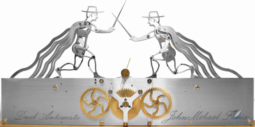 Jusqu'ici la magie des automates s'est accomplie dans des mouvements majestueux mais souvent lents. "Le Duel" de John-Mikaël Flaux revisite cette magie au travers d'un combat énergique et farouche entre deux silhouettes d'escrimeurs. On assiste à une opposition de la mécanique envers elle-même dans un combat perpétuel, mouvement contre mouvement, métal contre métal.