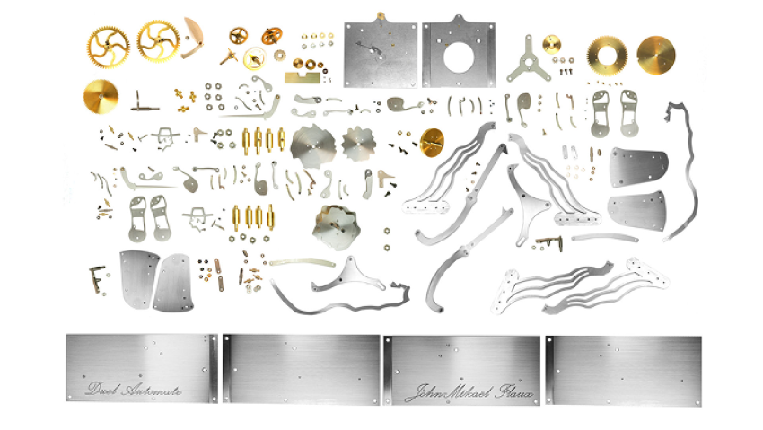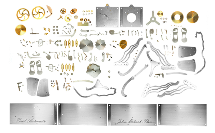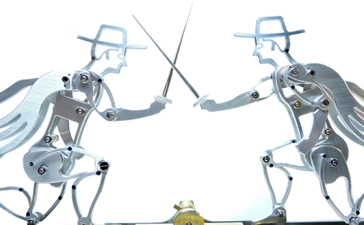 Au départ, seuls deux éléments prévalaient: l'idée d'un duel et une photo de combat d'escrime décomposé d'Eadweard Muybridge. De là, il a fallu tout dessiner, étudier, fabriquer, et tester. Du mécanisme moteur jusqu'au combat en passant par les musculatures, rien n'a été laissé au hasard. L'étude a pris presque autant de temps que la fabrication des 239 pièces spécialement créées pour l'occasion (122 découpages et 117 tournages). Les 217 autres composants déjà existants sont essentiellement des vis, goupilles, écrous, et composants horlogers du mécanisme moteur. Chacun d'entre eux a toutefois fait l'objet de modifications et de finitions esthétiques.
