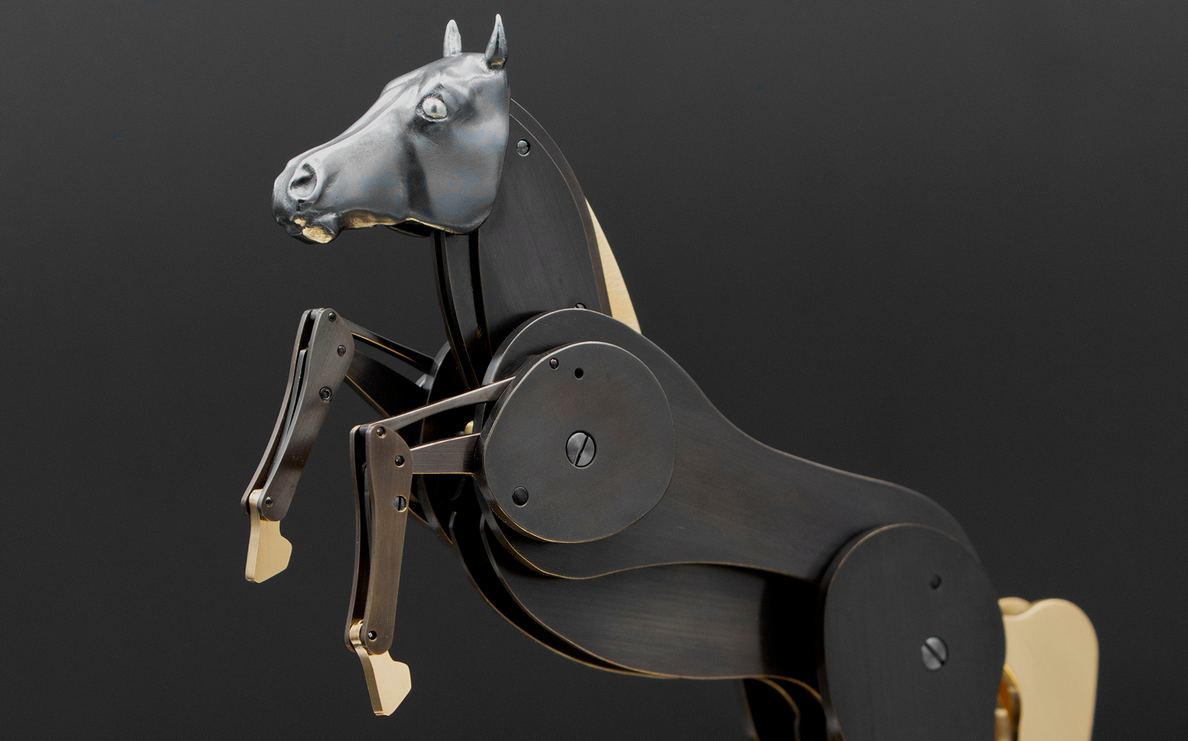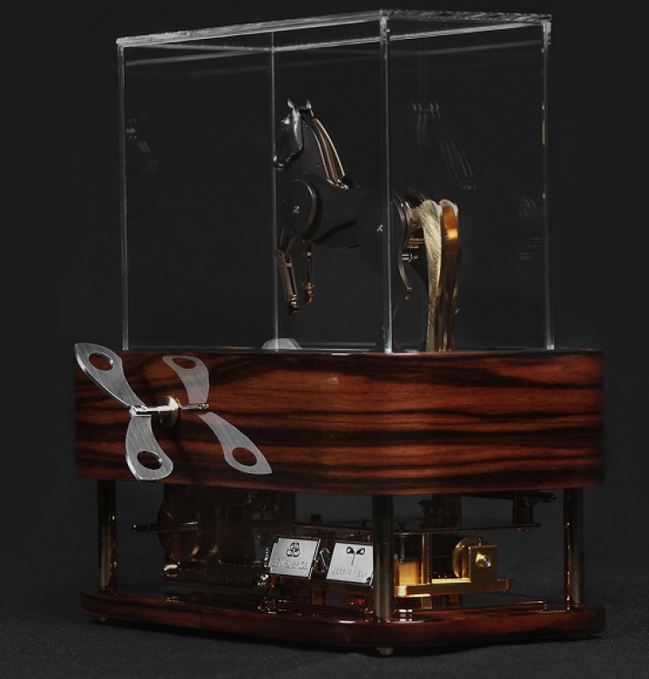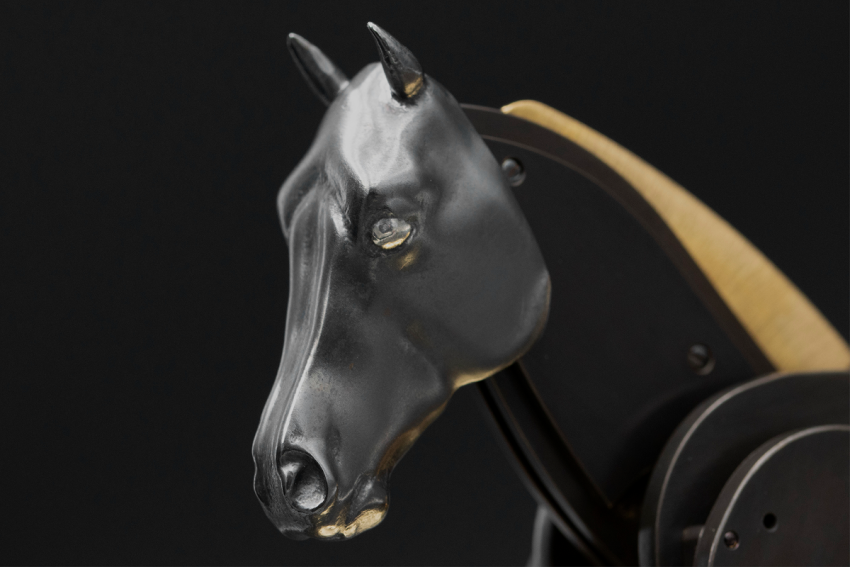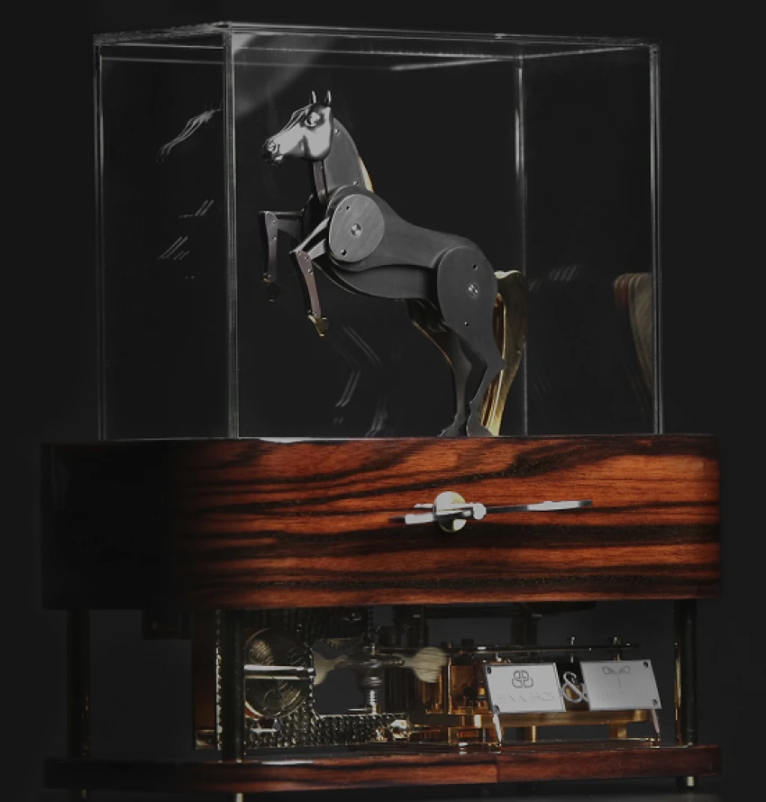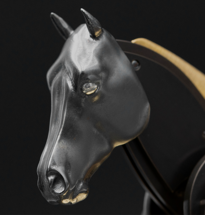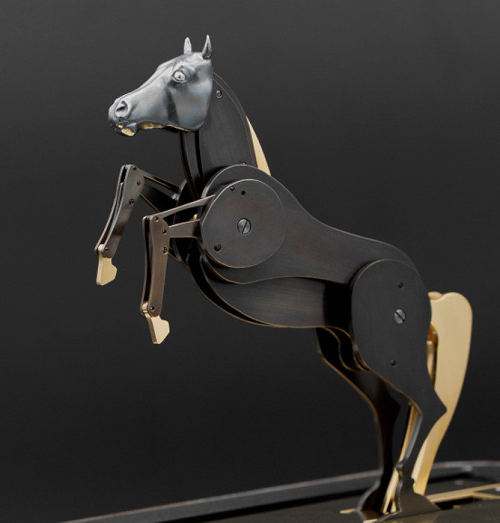 Fascinant l'humanité à travers les âges comme son plus fidèle compagnon et sa plus noble conquête, le cheval a acquis le statut d'animal mythique vivant. Présents aux côtés de l'homme depuis toujours, leurs silhouettes ornent les plus anciennes peintures rupestres, leur allure rythme le quotidien de milliers de passionnés de pur-sang. Les artistes ont toujours été confrontés au défi de reproduire mécaniquement leur foulée puissante. Le cabré, en particulier, a longtemps résisté aux fabricants d'automates. Jusqu'à présent.