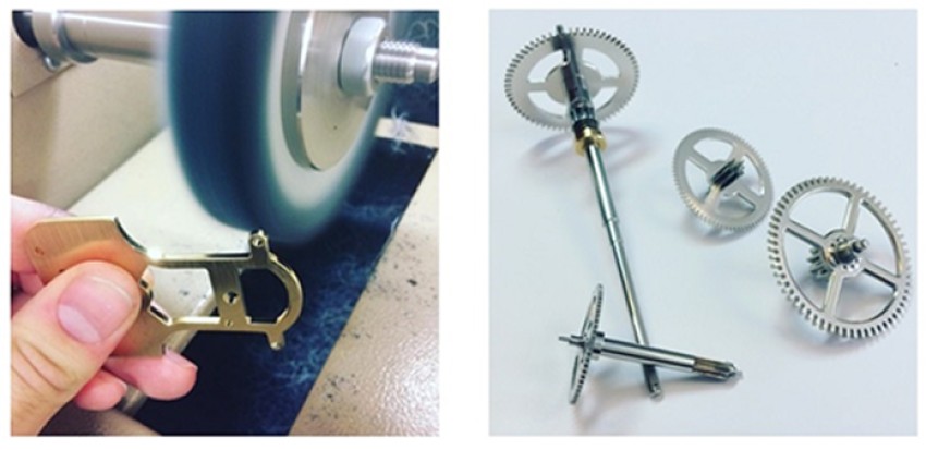 Les platines et les roues du mécanisme sont en laiton polies et brossées puis palladiumées, les pilliers et pignons sont en acier.