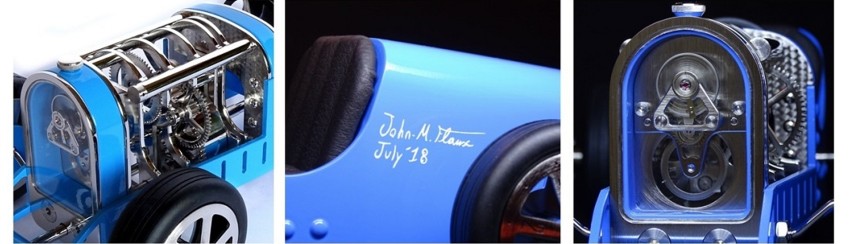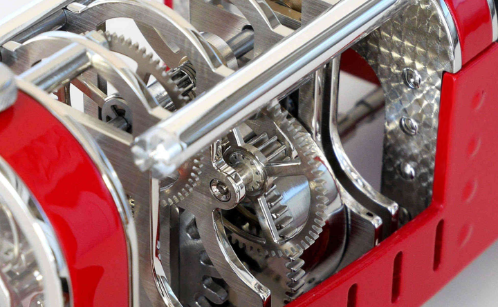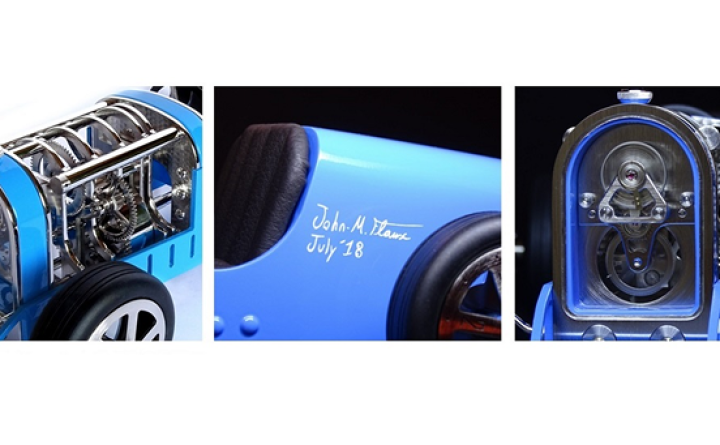 Conçue et fabriquée par John-Mikaël Flaux, la Car Clock nécessite 1 mois de fabrication fait main pour exécuter et assembler ses 270 pièces dans les règles de l'art horloger (finitions polissage, brossé, anglage, …etc).