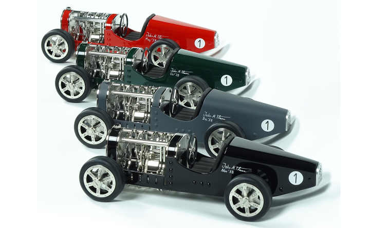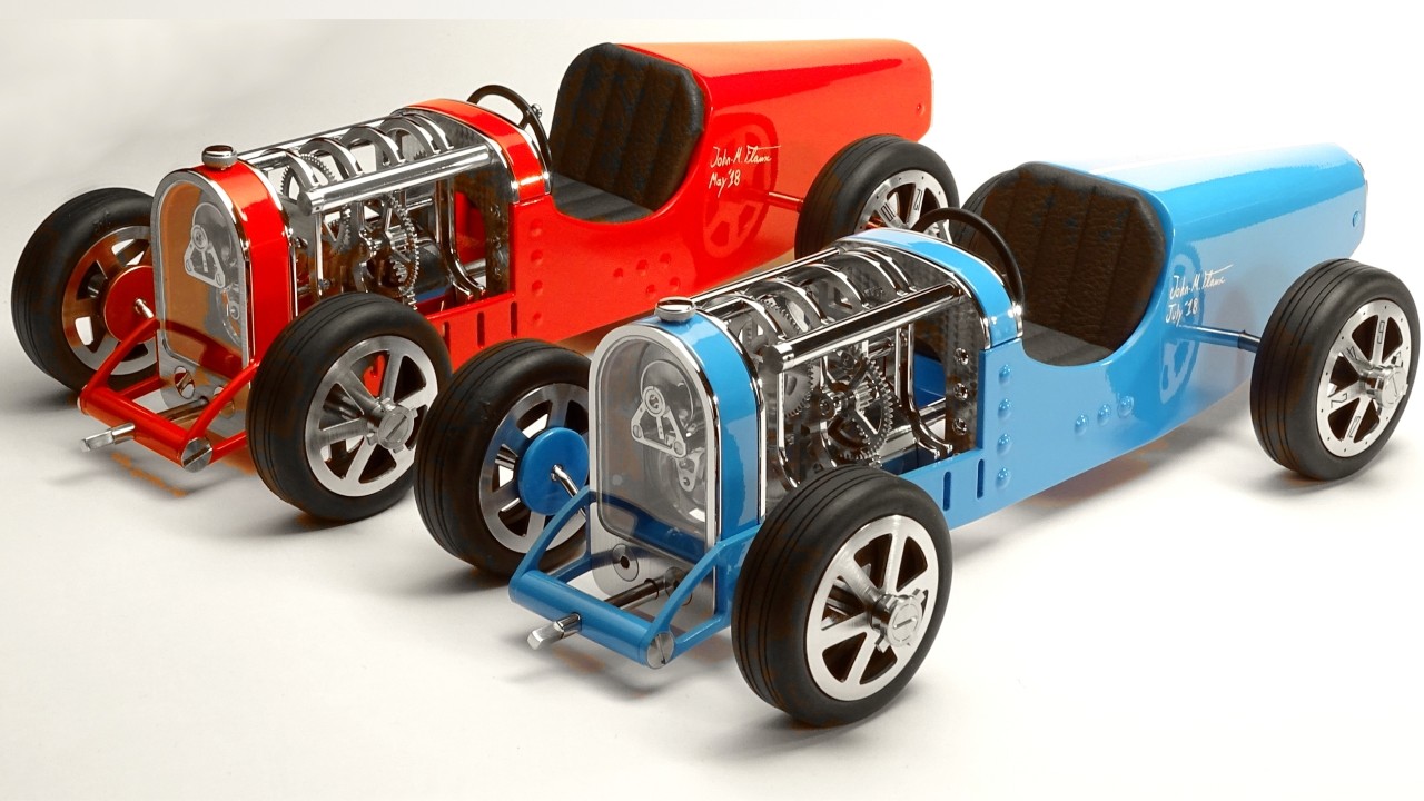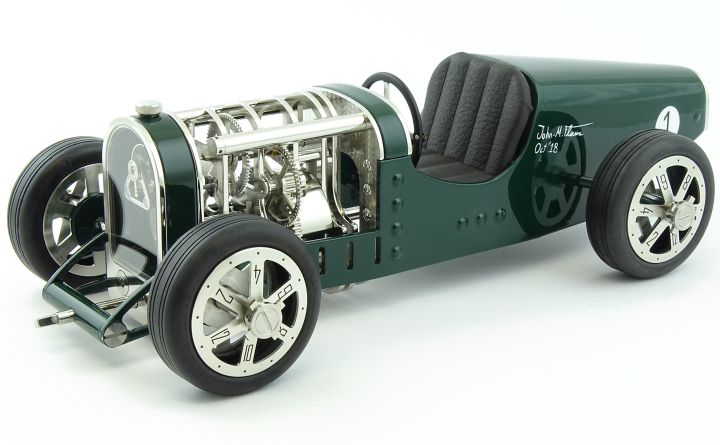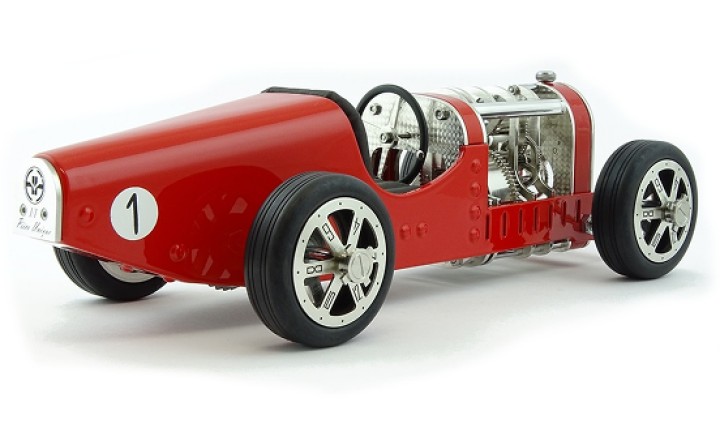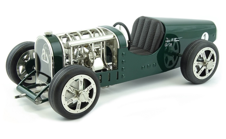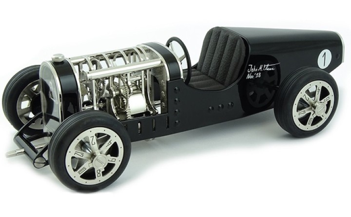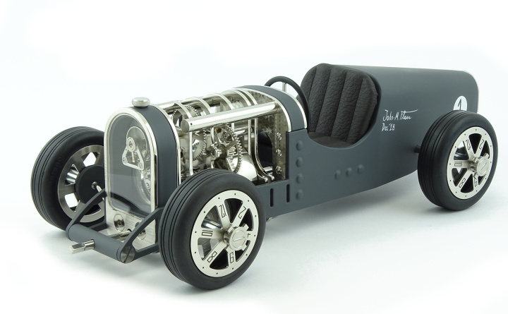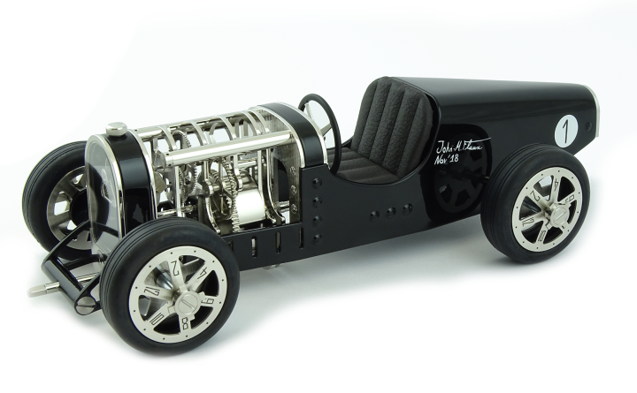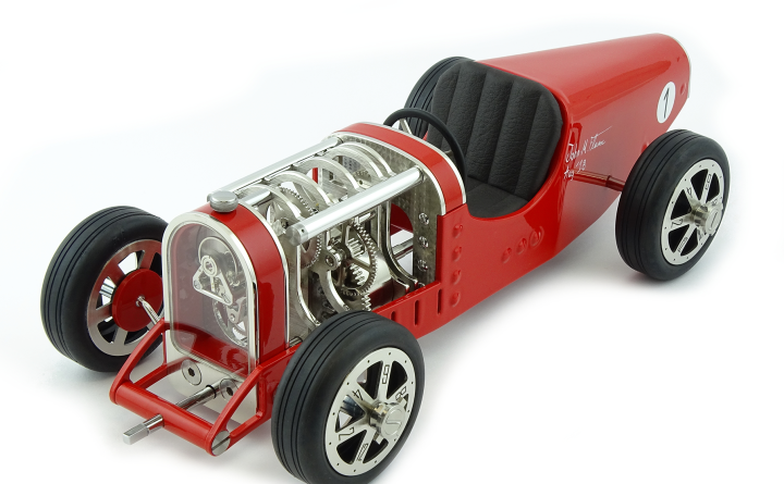 Inspirée des voitures de course des années 30 telles que la célèbre Bugatti T35, Amilcar C6 ou encore Alfa Roméo P3, la Car Clock se glisse sur les pistes empruntées par ces voitures aussi rapides que mythiques.