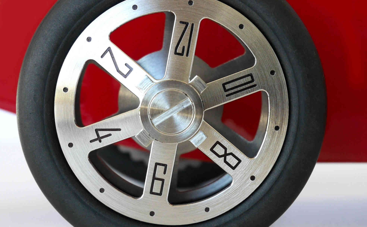 L'heure est lisible via des chiffres gravés sur les jantes arrières et un index sur le volant permet quant à lui de préciser la minute. La propulsion des roues permet à la Car Clock de rouler à une vitesse de 13 mm/h soit 30 cm par jour.
