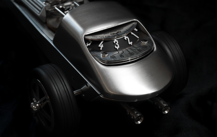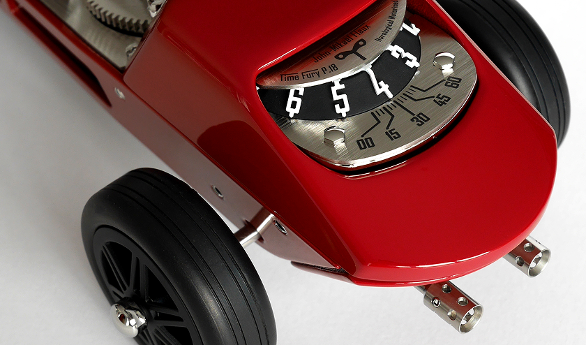L'indication horaire est lisible à l'arrière via des heures suspendues dont la pointe précise la minute sur un secteur gradué. La propulsion des roues permet à la Time Fury P18 de rouler à une vitesse de 13,2 mm/h soit 31 cm par jour.